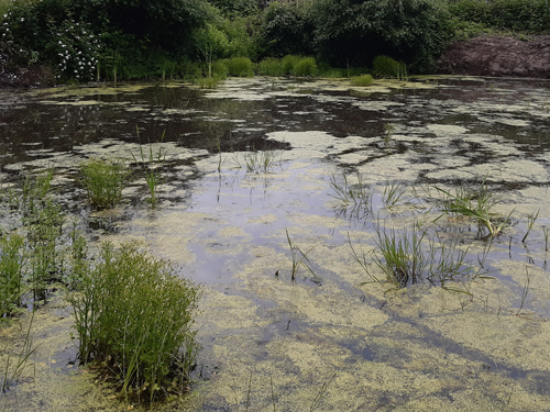 - viele Wasserlinsen und schwimmende Pflanzen auf Gewässeroberfläche