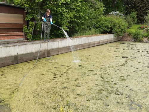 - viele Wasserlinsen und Fadenalgen auf der Gewässeroberfläche